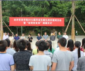 今日离校苗,明年桂花香。2012年5月17日下午4点,经贸学院2012届毕业生献礼校庆植树活动暨“经贸校友林”揭幕仪式在南岸校区举行。党委副书记朱伯兰,党委副书记、纪委书记周航,党政办公室、校庆办、校团委领导,经贸学院全体院领导、辅导员老师以及往届校友代表和2012届毕业生代表出席了此次揭幕仪式。