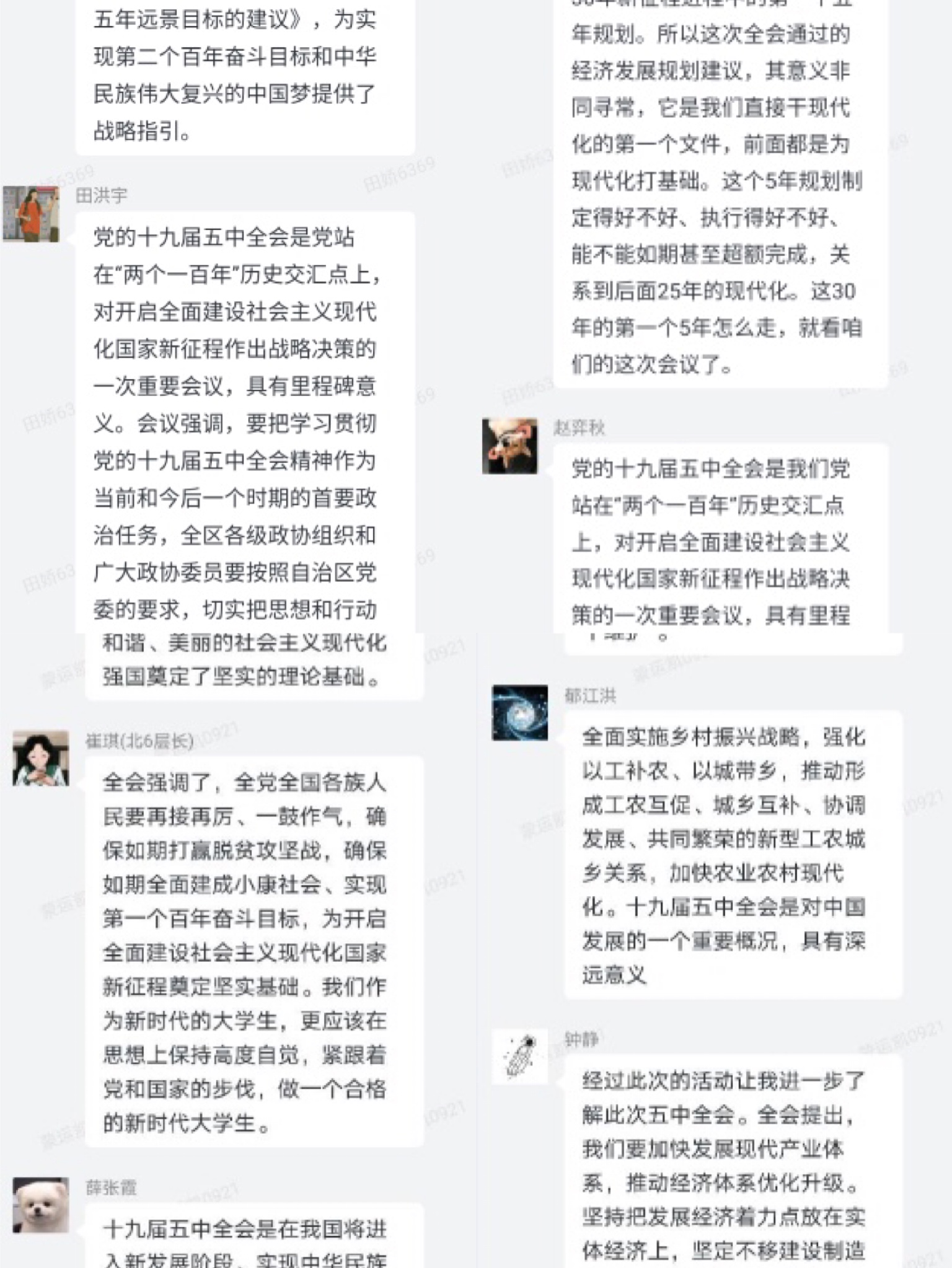 为深入学习领会党的十九届五中全会精神,切实扛起当代青年责任使命,欢迎光临888集团网站分团委发起了系列以“学习党的十九届五中全会精神”为主题的学习活动。自活动发起以来,得到全院青年学子积极相应,各团支部、学生组织认真学习研讨,掀起了学习十九届五中全会精神的新风尚。