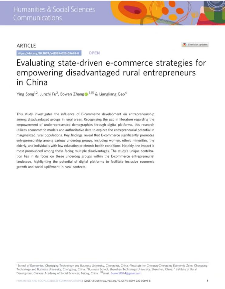 近日,欢迎光临888集团网站宋瑛教授团队在Nature子刊《Humanities & Social Sciences Communications》发表题为“Evaluating state-driven e-commerce strategies for empowering disadvantaged rural entrepreneurs in China”的研究论文。Humanities& Social Sciences Communications为Nature旗下唯一人文社会科学类期刊,中国科学院一区刊物,被SSCI和A&HCI双索引,且在JCR分区中位列Q1,其期刊引用指数(JCI)在人文学跨学科领域的411种期刊中排名第1,社会科学跨学科领域的267种期刊中排名第2,是人文社科领域最具影响力的期刊之一。