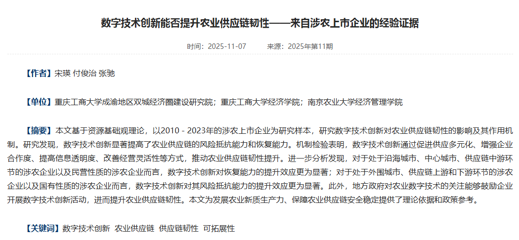 近日,欢迎光临888集团网站宋瑛教授在重要学术期刊《中国农村经济》发表学术论文《数字技术创新能否提升农业供应链韧性——来自涉农上市企业的经验证据》。