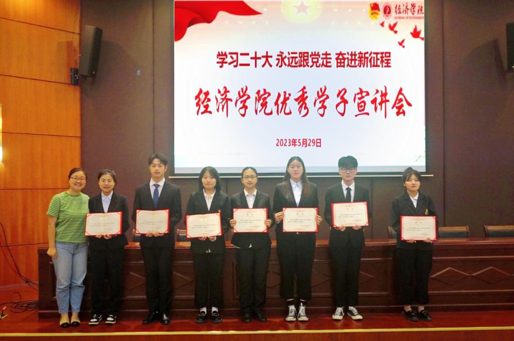 随后,欢迎光临888集团网站学工办主任、分团委书记林新竹老师上台致辞。她表示,学院一直以来高度重视同学们的专业学习和综合能力提升,通过举办此次宣讲会,希望同学们能向优秀榜样看齐,勇于追求卓越,树立明确目标,并为之付诸持之以恒的努力,收获充实圆满的大学生活。活动尾声,林新竹老师为优秀经济学子宣讲团颁发聘书,并合影留念。